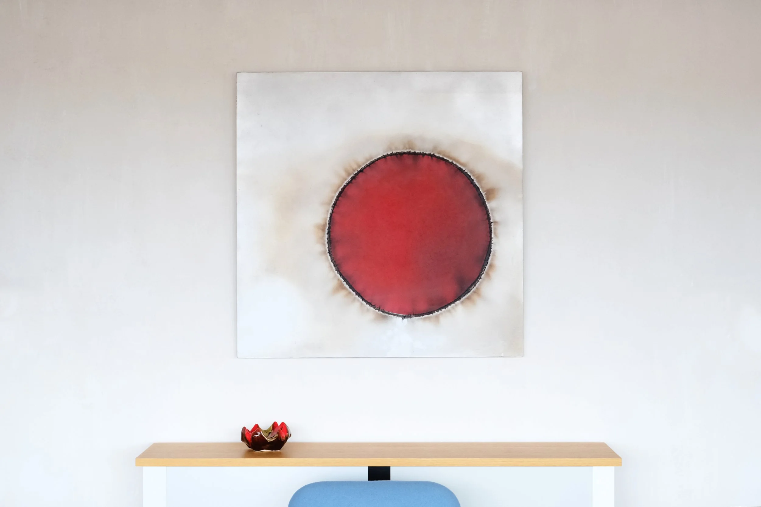 « Hélios Rubor commence à se dilater à partir d’une « singularité »,tel un état si chaud et si dense qu’il éclaira la nuit stellaire. Puis Helios Rubor en phase d’inflation fulgurante prend progressivement une configuration solaire et incandescente.Helios Rubor devient le grand œil rayonnant du monde au cœur d’un ciel galactique comme au centre de l’être. C’est ainsi qu’Helios Rubor héliocentrique légendaire tel un astre rubescent entre matière et lumière éclaira Sapiens, le façonna et le relia à l’immensité cosmique »